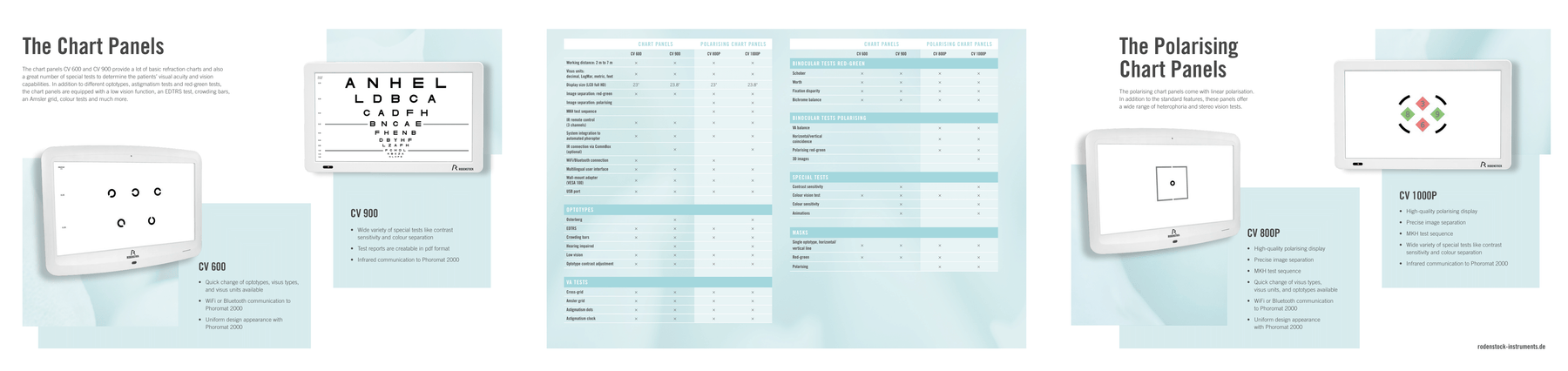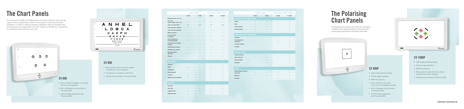 CV 700P, CV 800P, CV 1000P feature linear or circular polarized displays for stereo and heterophoria Screen Size & Display