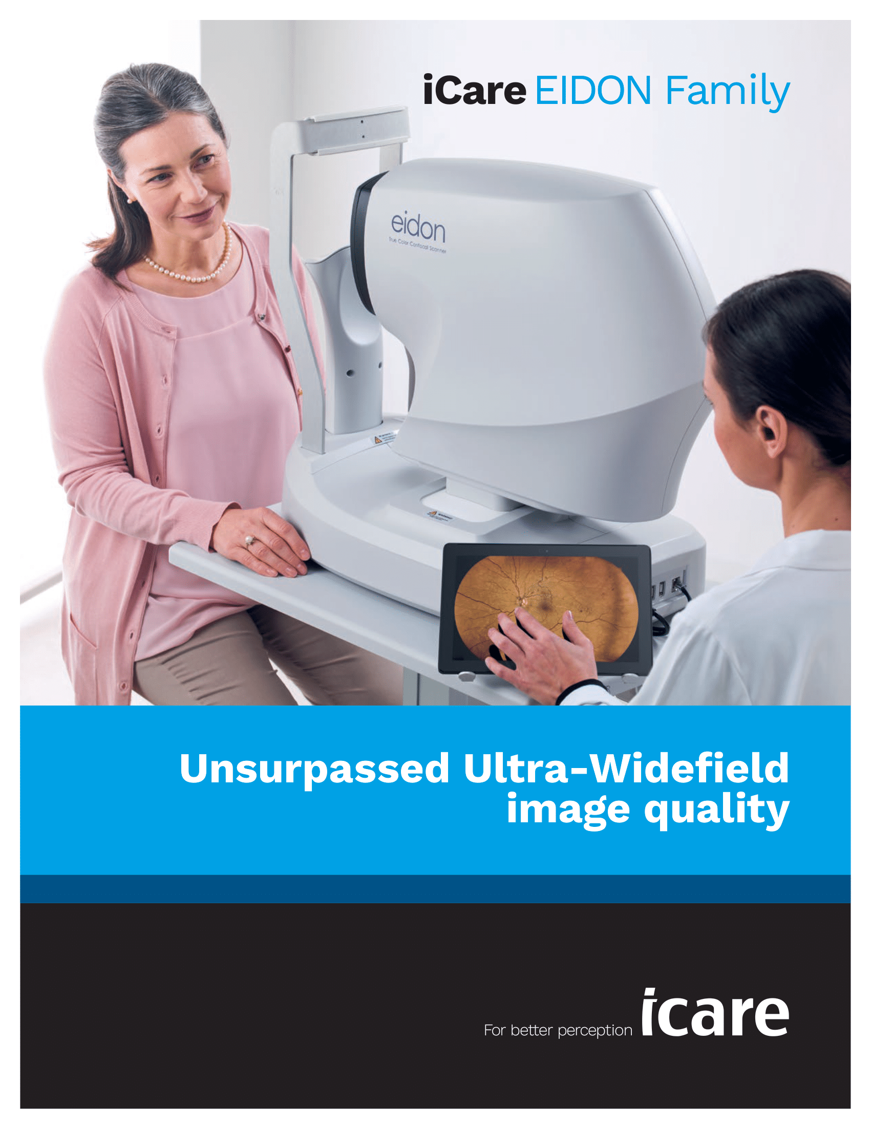 Device is self-contained with no external PC required. Built with a motorized chin rest and ergonomic interface for efficient use in tight clinical spaces