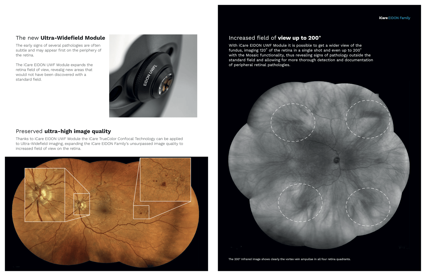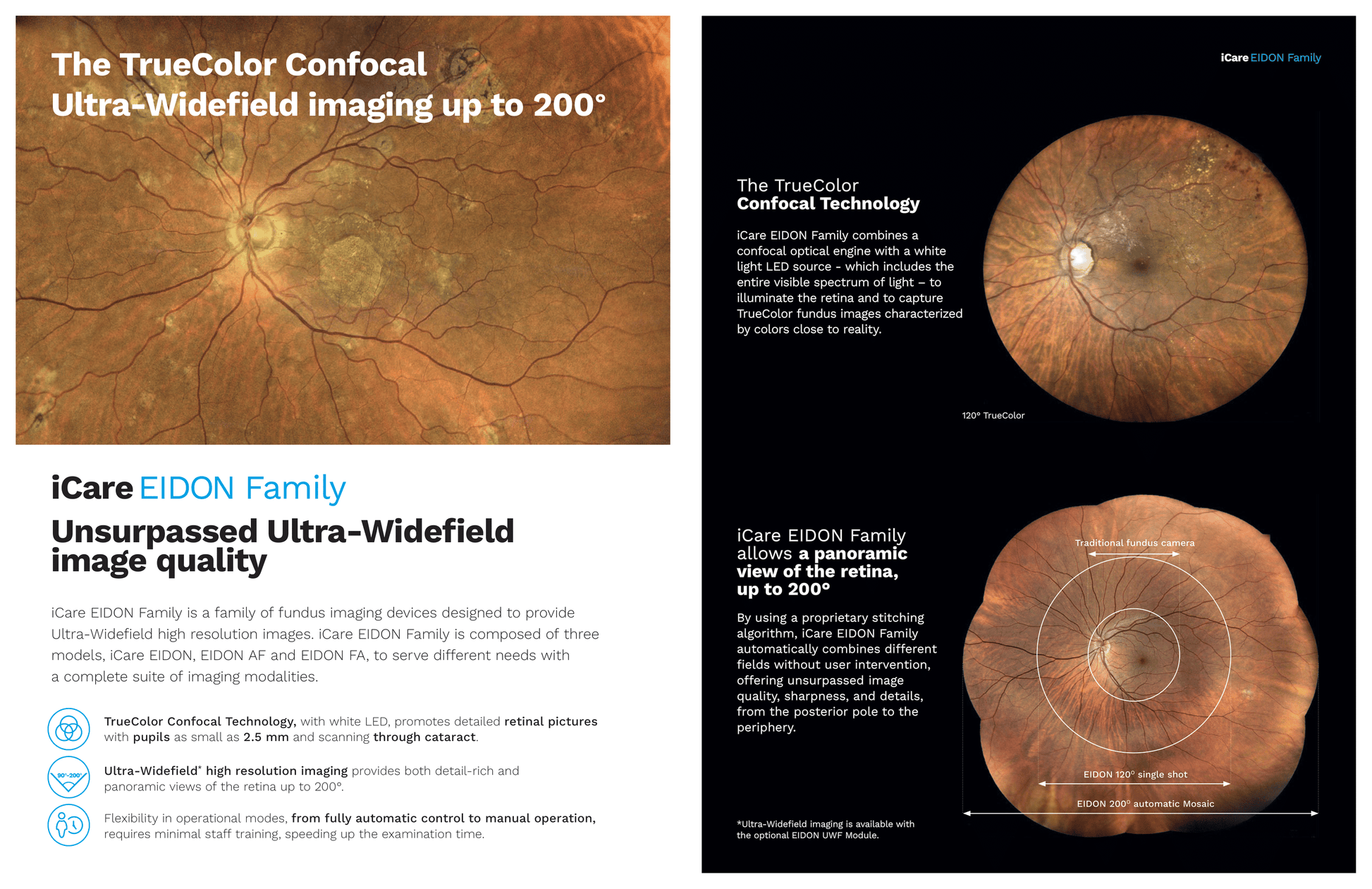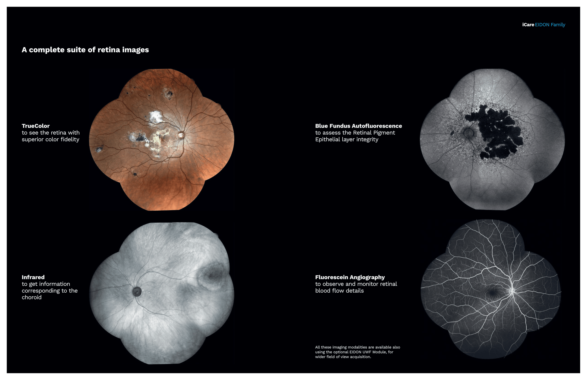 Optional module captures up to 120° in a single shot and uses Mosaic stitching to achieve up to 200° panoramic view. Available for all EIDON models with TrueColor, infrared, autofluorescence, and FA modalities
