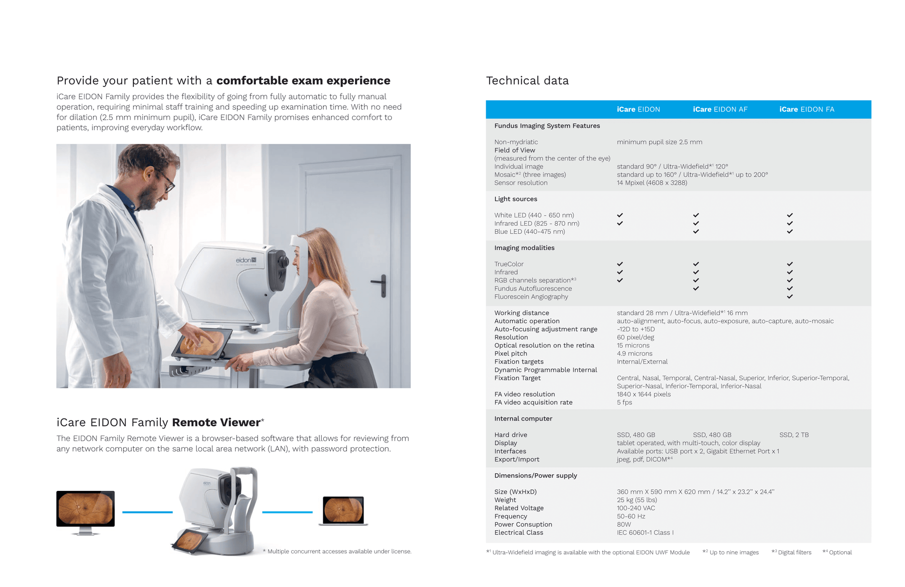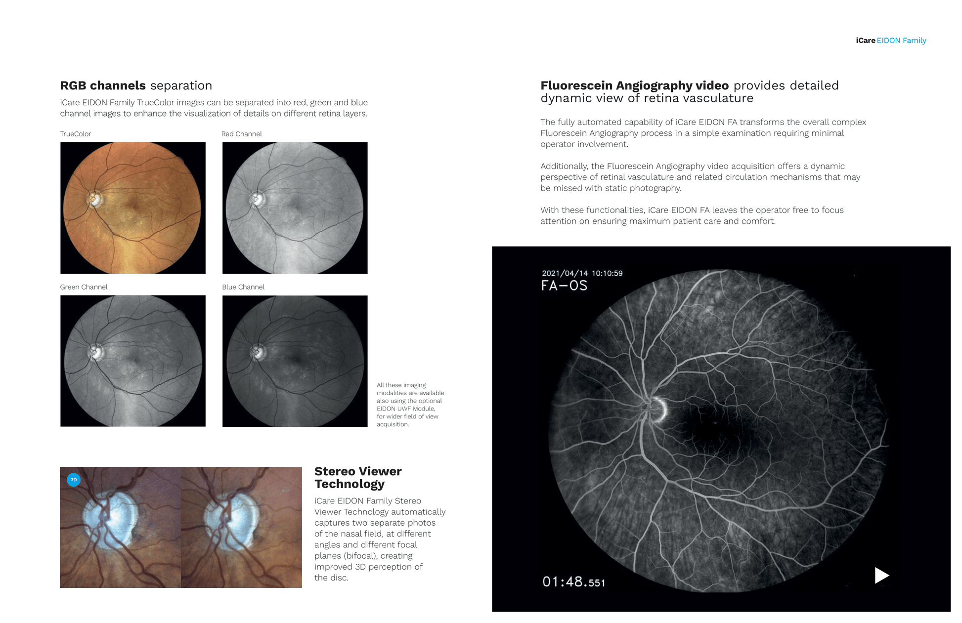 EIDON AF adds blue autofluorescence imaging; EIDON FA supports dynamic fluorescein angiography (FA video); infrared and red-free modes are available across models for comprehensive diagnostics