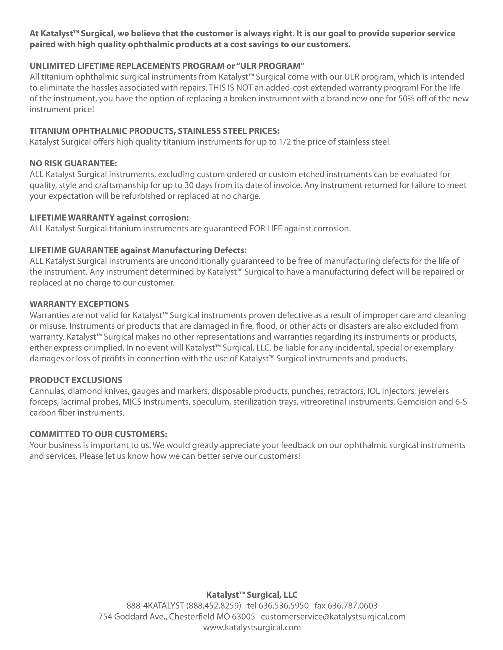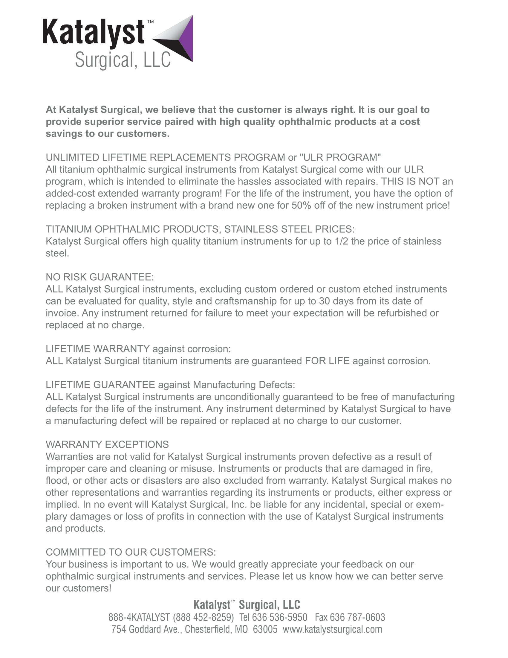 Katalyst Surgical delivers expertly crafted titanium ophthalmic instruments that prioritize precision, durability, and operational efficiency. Their Unlimited Lifetime Replacements (ULR) Program guarantees effortless instrument replacement, minimizing downtime. Additionally, the no-risk 30-day trial empowers professionals to thoroughly evaluate the instruments’ performance, ensuring confidence in their surgical tools. This commitment to quality and service supports superior clinical outcomes.