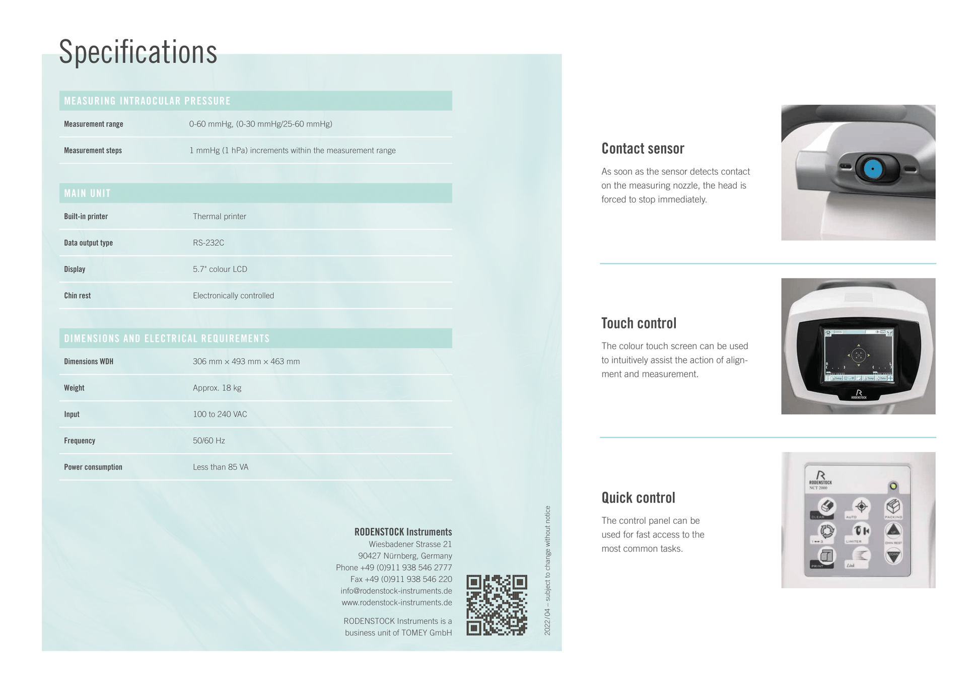 The NCT 2000 Non-Contact Tonometer by Rodenstock Instruments is a state-of-the-art device designed for accurate and safe intraocular pressure (IOP) measurement. Featuring a contact sensor for immediate safety and a 5.7-inch color touchscreen for intuitive operation, the NCT 2000 ensures precise measurements with a range of 0-60 mmHg in 1 mmHg increments. It includes XP correction for enhanced accuracy and an electronically controlled chin rest for patient comfort. With a built-in thermal printer and RS-232C data output, it seamlessly integrates into clinical workflows. Compact, user-friendly, and reliable, the NCT 2000 is ideal for optometrists and ophthalmologists seeking efficient, non-invasive IOP measurement solutions.