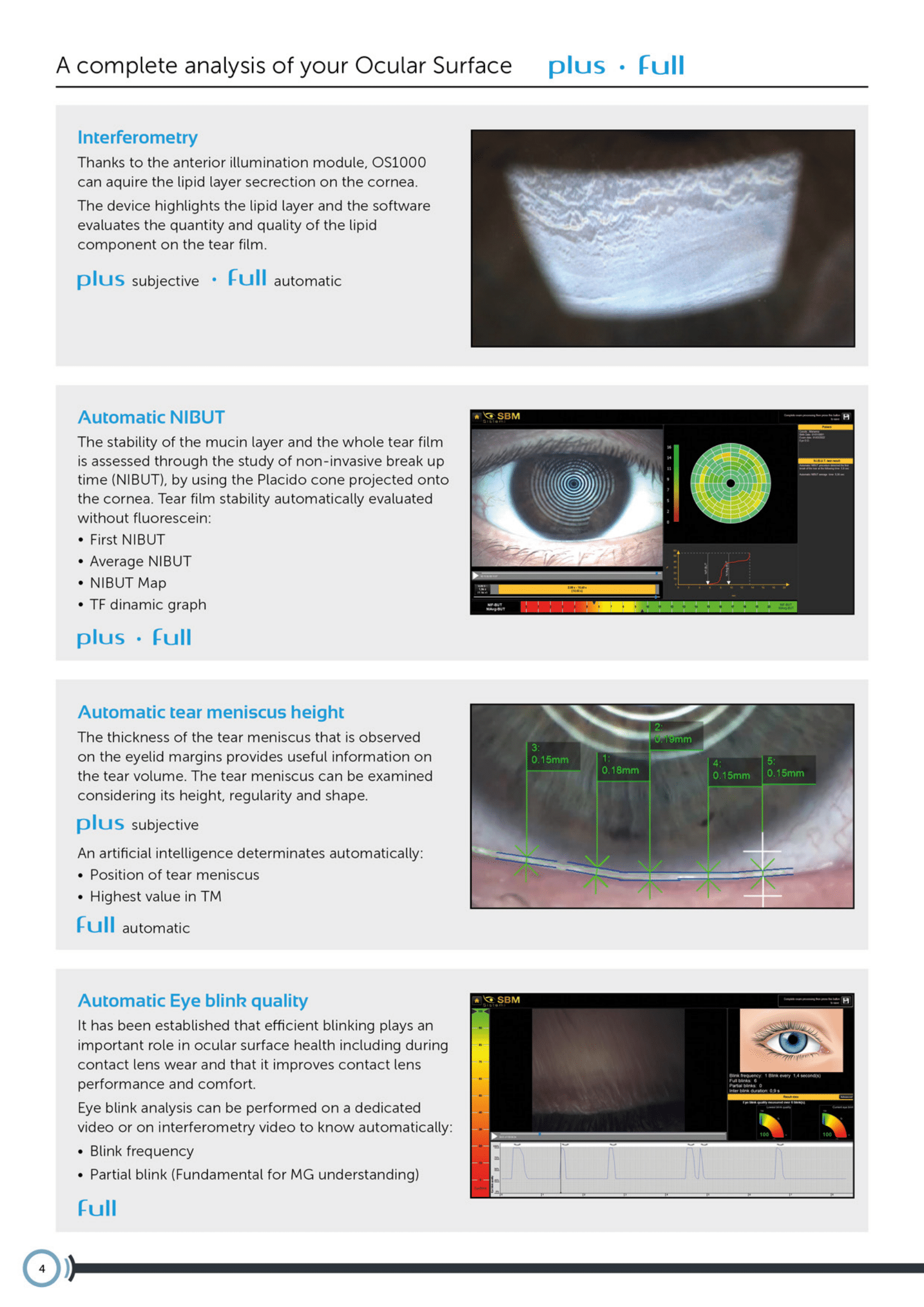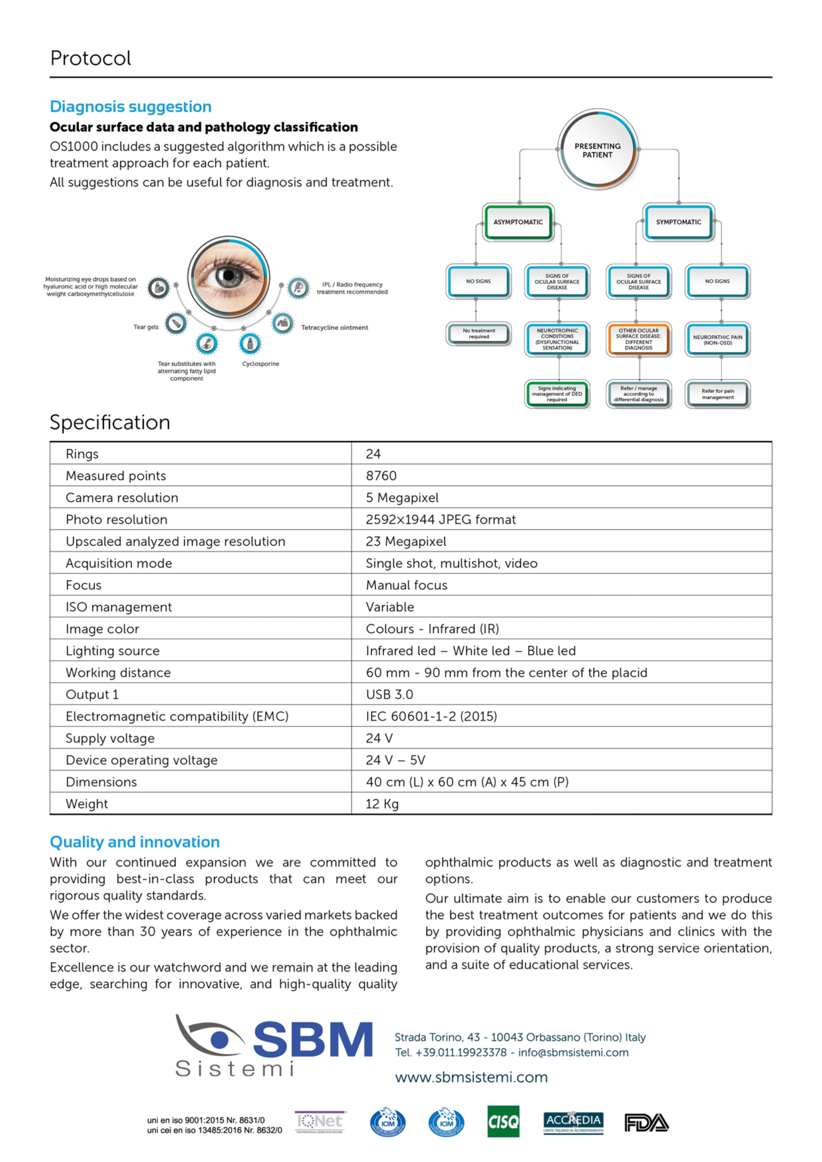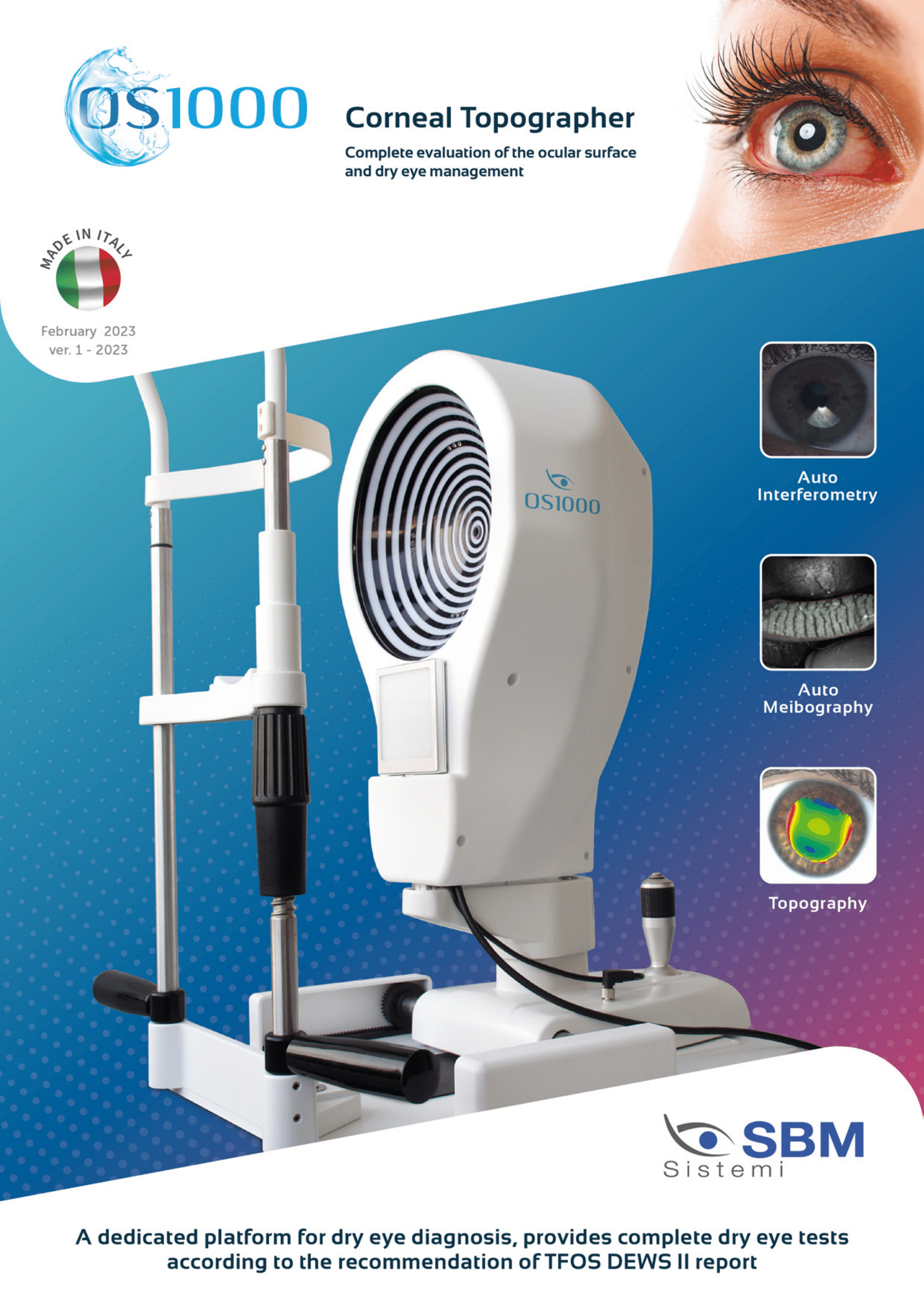 The OS1000 Corneal Topographer by SBM Sistemi is a state-of-the-art diagnostic platform designed for comprehensive ocular surface analysis and dry eye management. Combining advanced corneal topography, interferometry, meibography, and tear film evaluation, the OS1000 provides a complete suite of tests aligned with TFOS DEWS II recommendations. Key features include automatic NIBUT (Non-Invasive Break-Up Time), tear meniscus height measurement, 3D meibography, and keratoconus screening, enabling precise diagnosis and tailored treatment plans. With user-friendly operation, fast acquisition, and detailed reports, the OS1000 enhances patient care by offering accurate, non-invasive assessments and treatment suggestions. Ideal for modern eye care practices, it supports contact lens fitting, pupillometry, and dry eye follow-up, making it a versatile tool for improving ocular health outcomes..