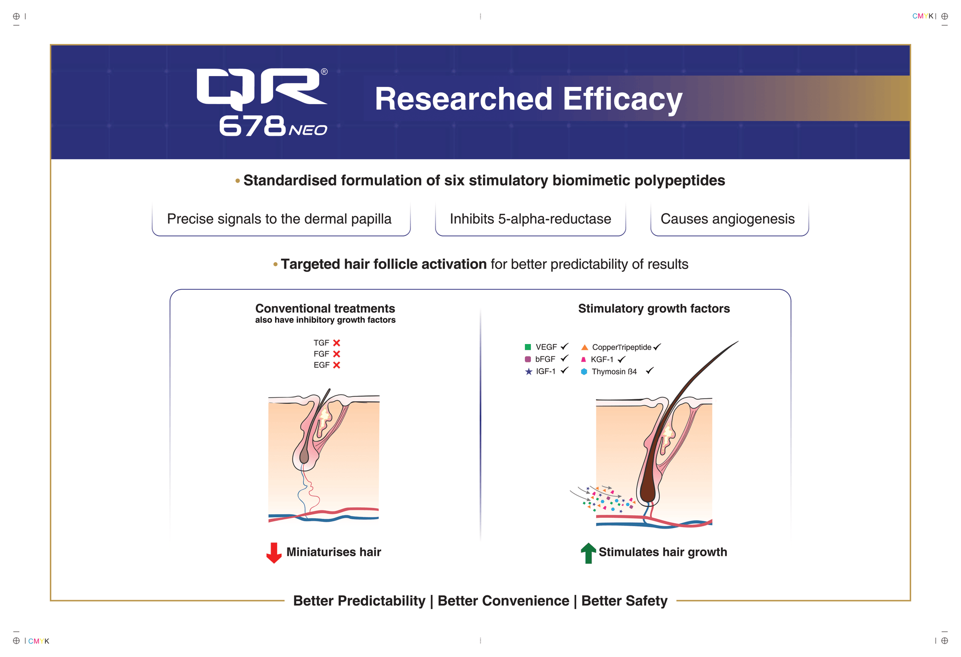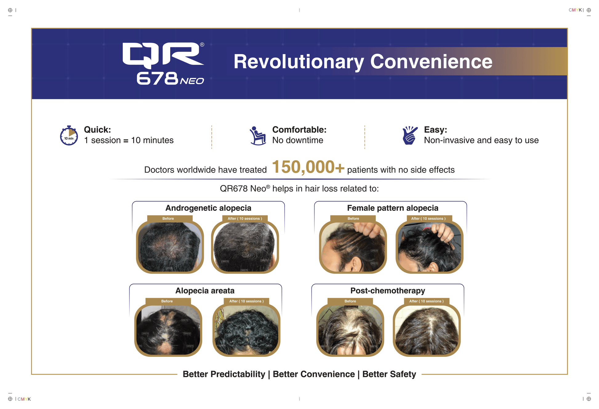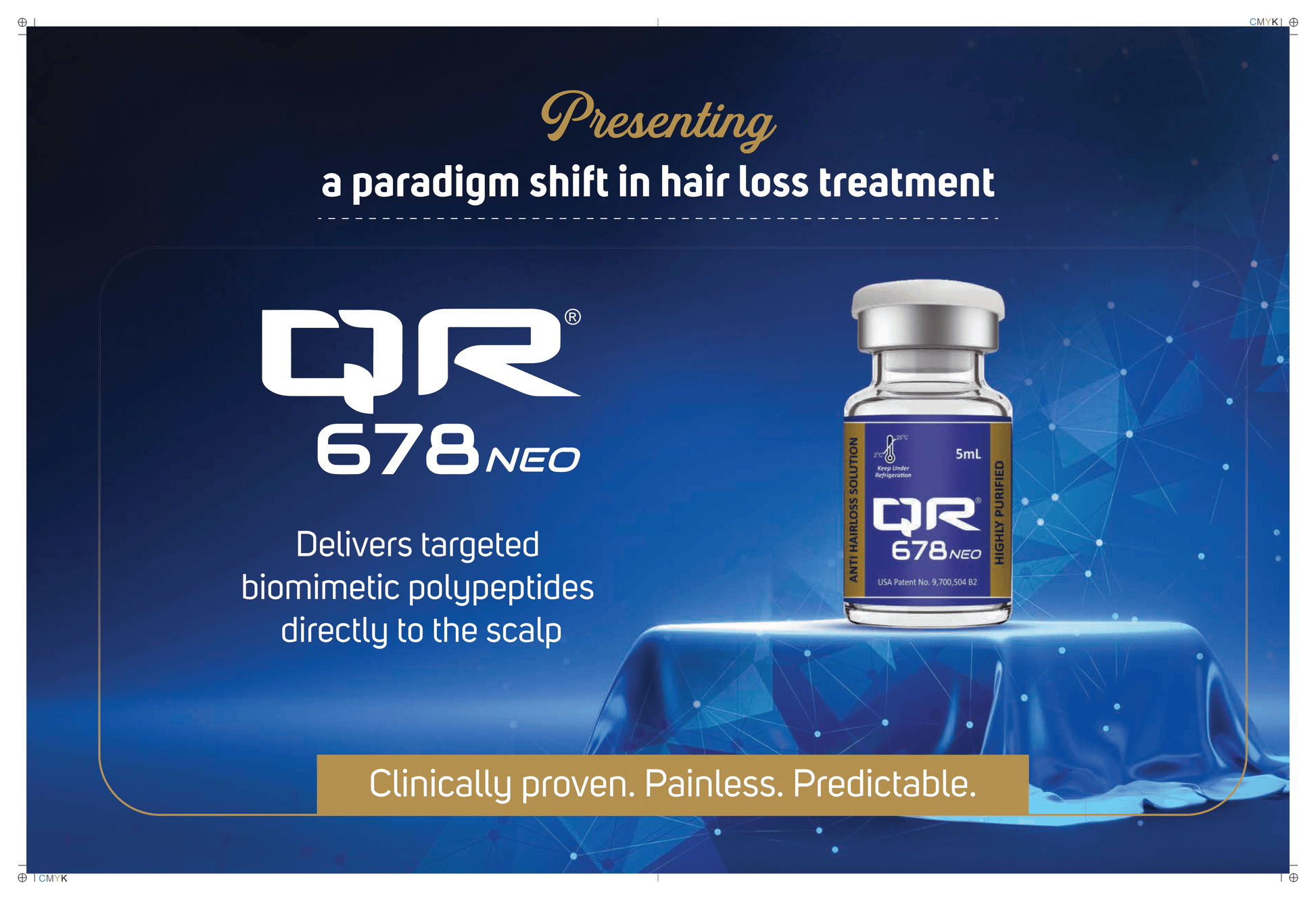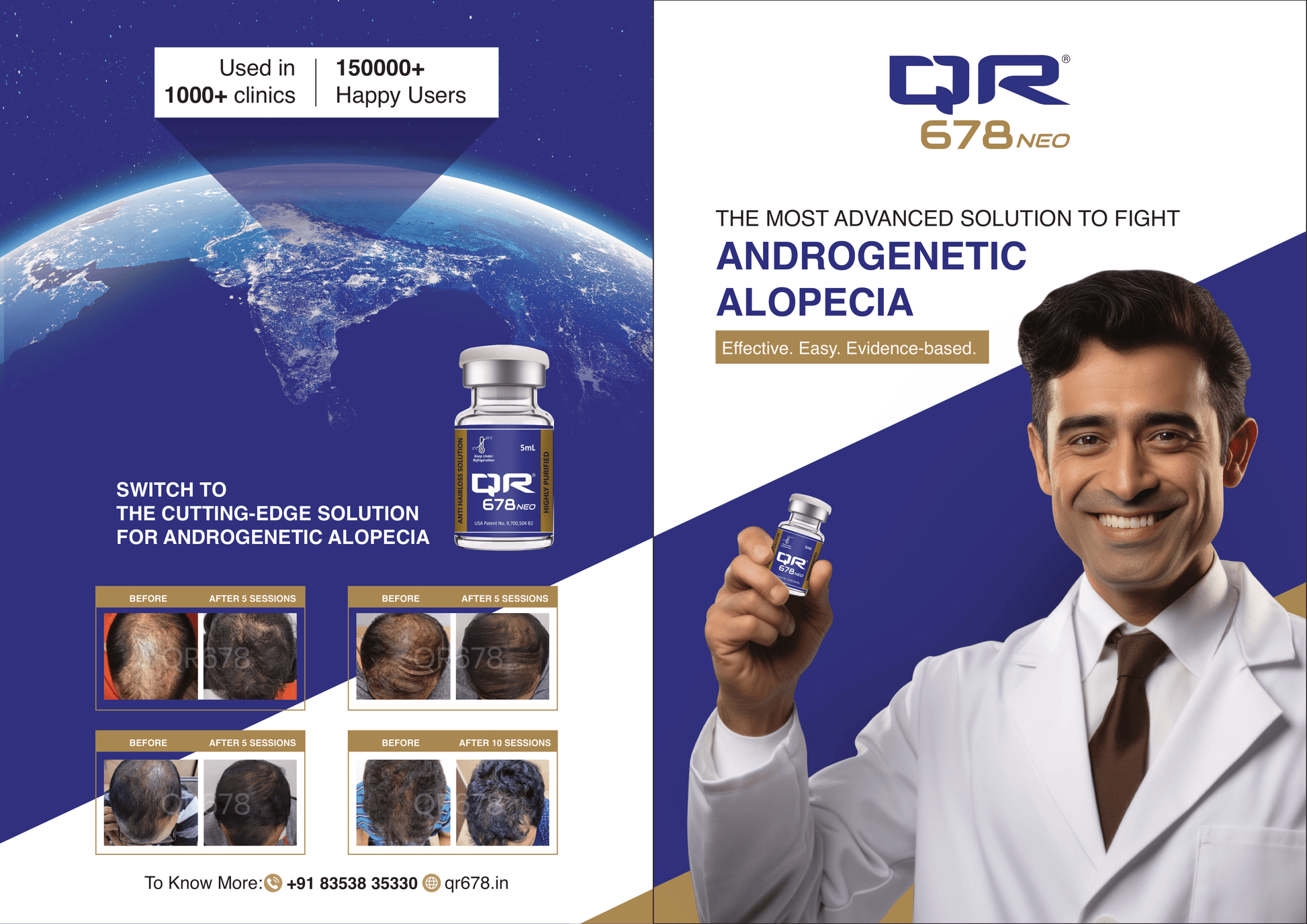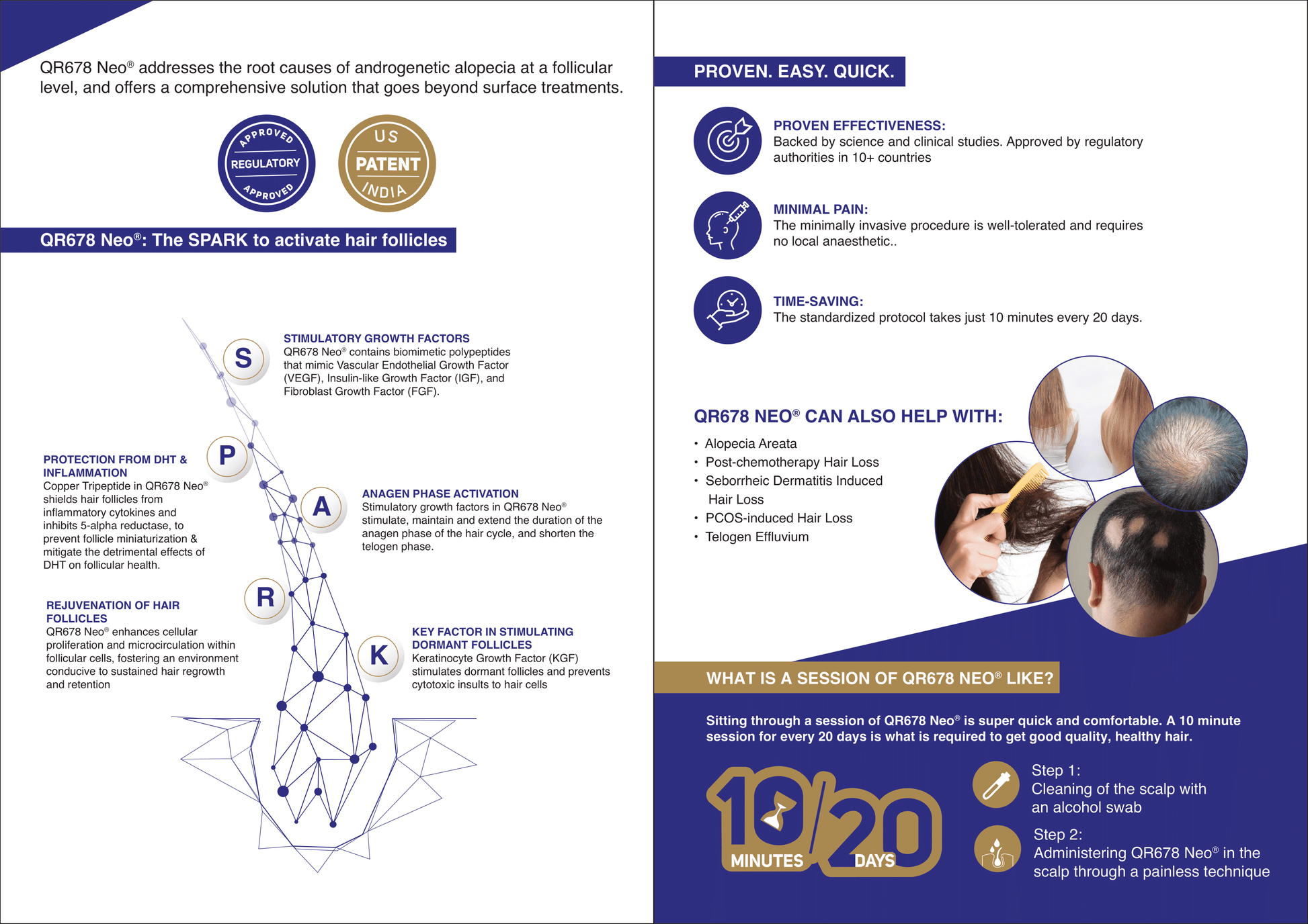 QR 678 Neo is an FDA‑approved topical hair regrowth protocol combining derma-roller delivery with patented biomimetic peptides. It has shown over 90% success in clinical settings—improving hair density and reducing shedding in male/female pattern baldness and alopecia—without surgery or PRP.