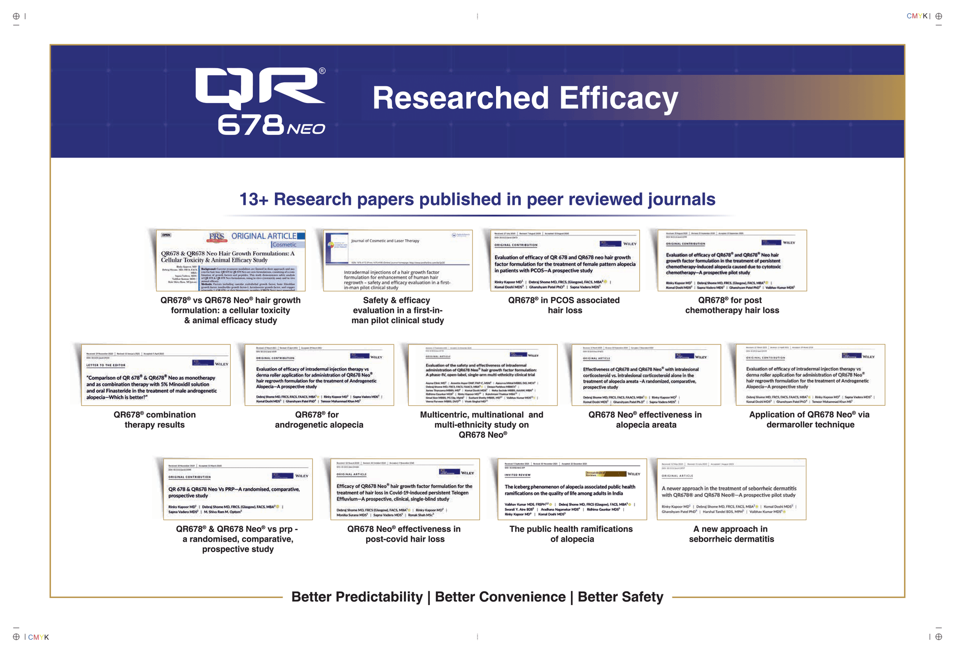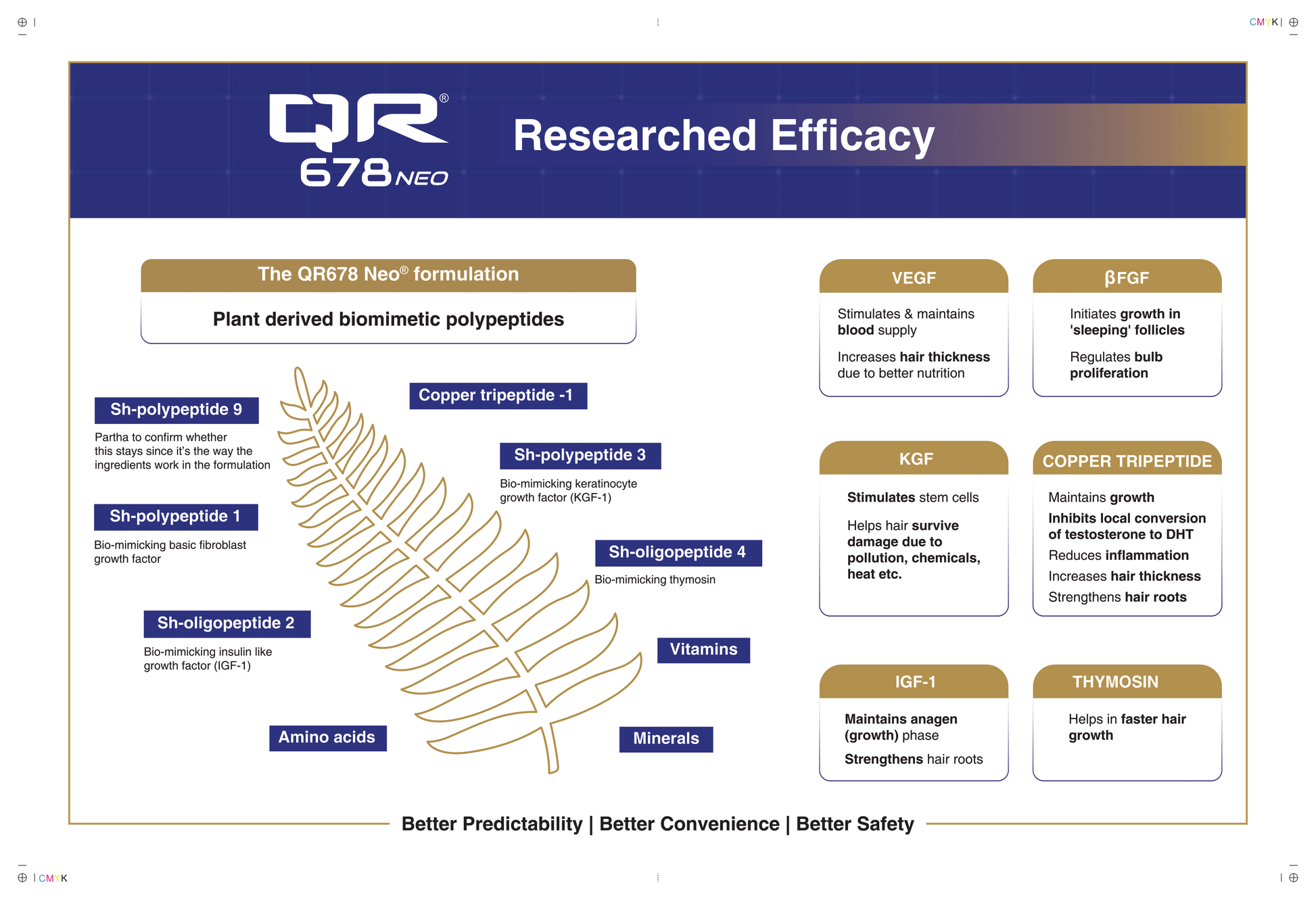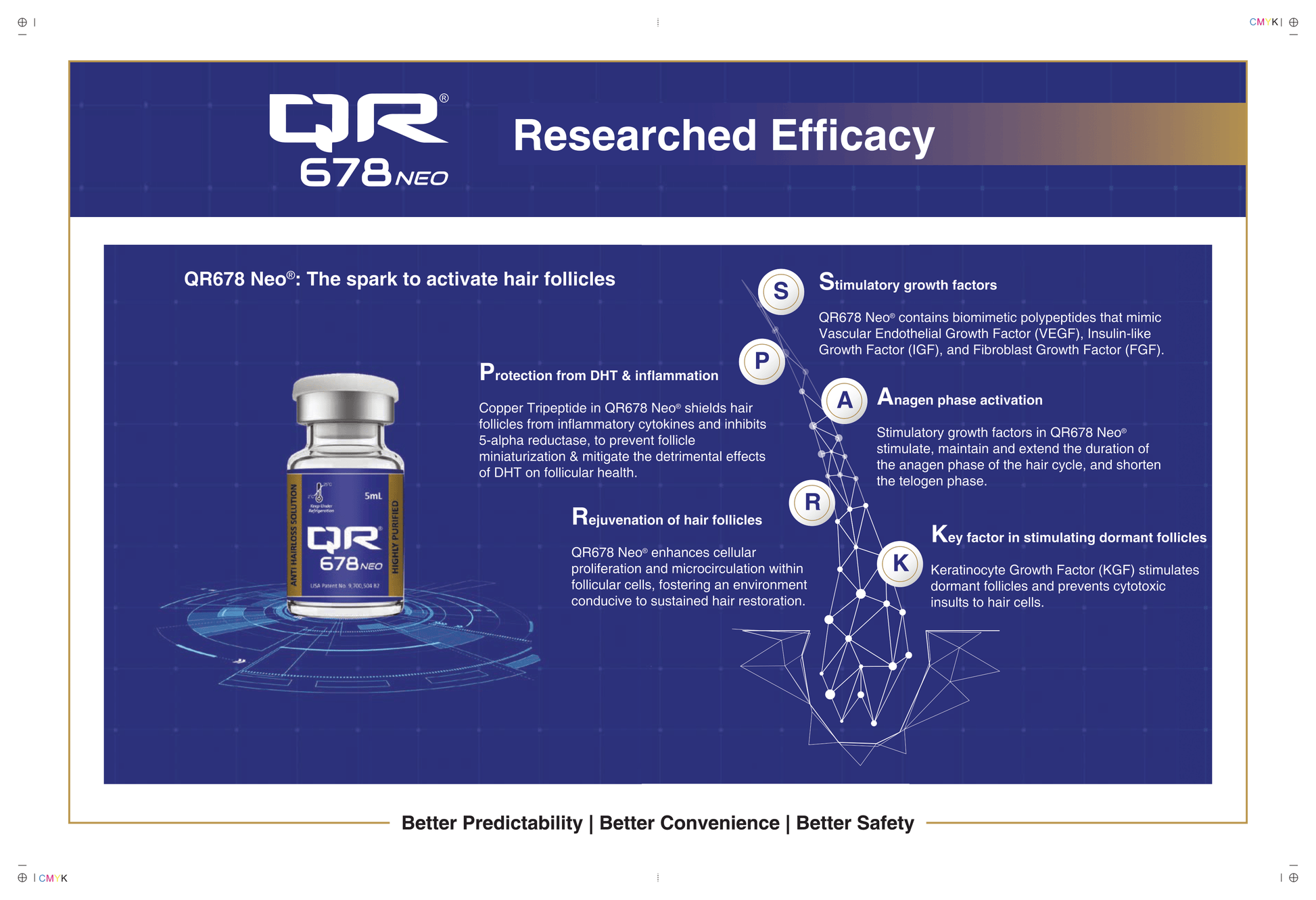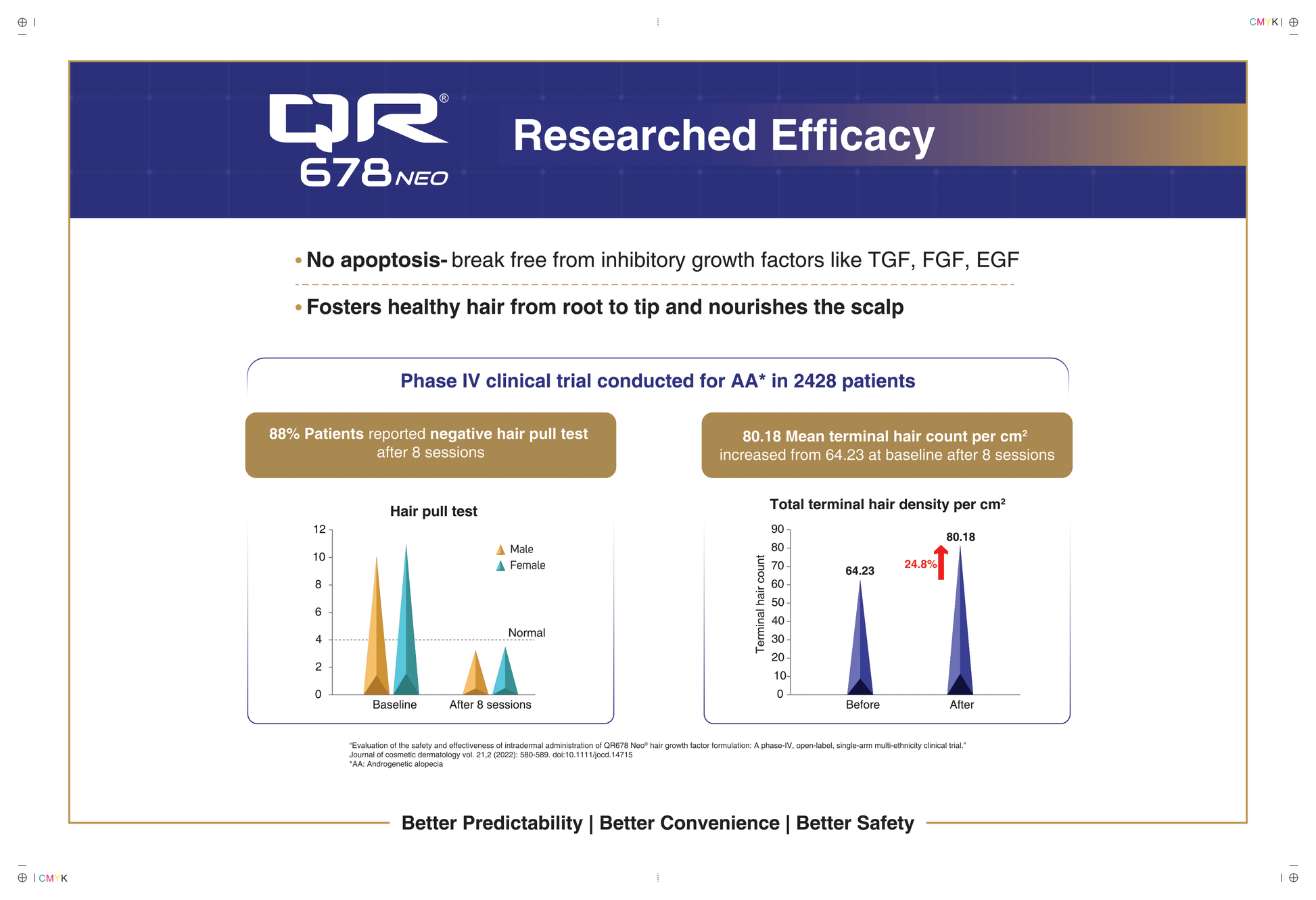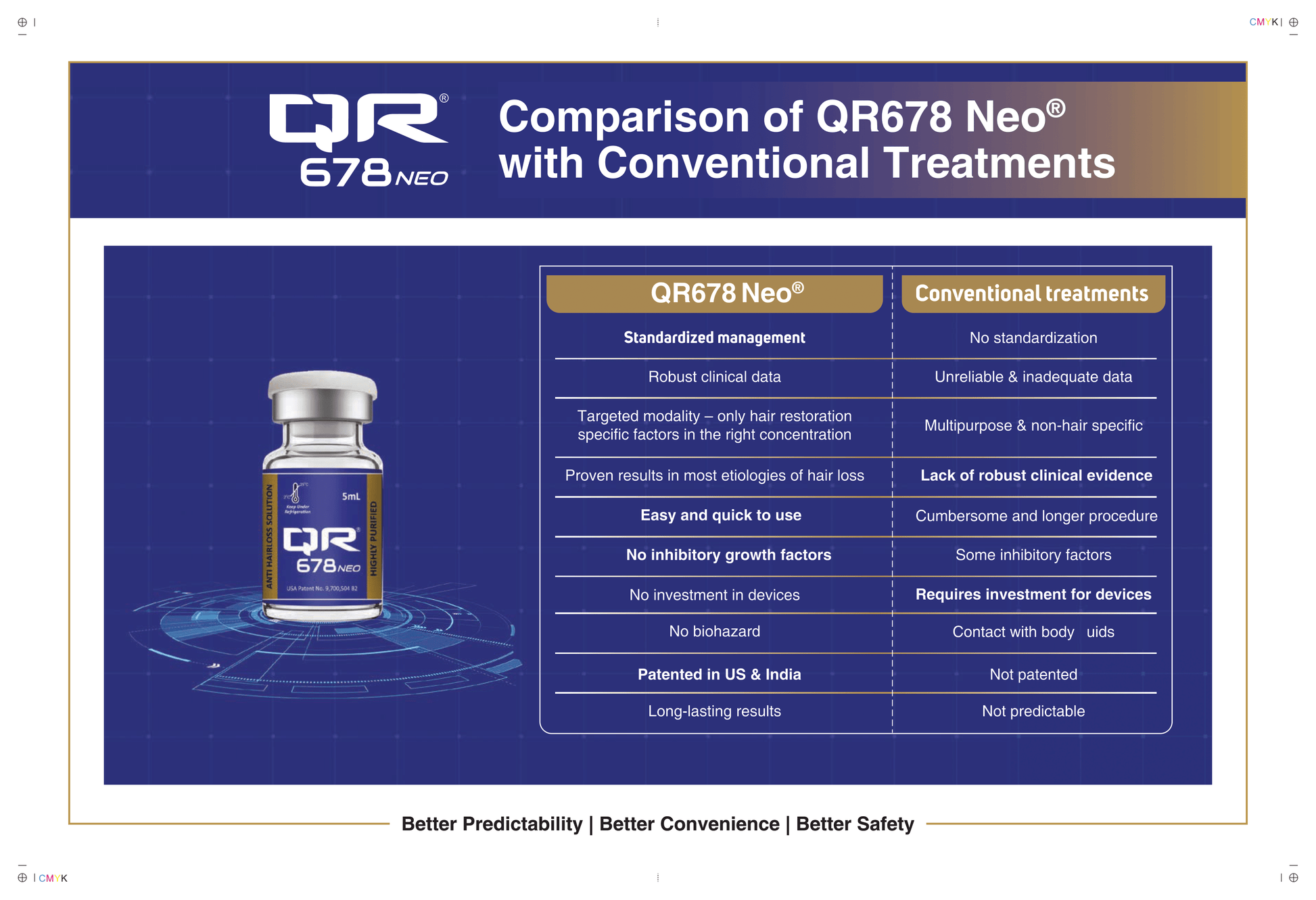 QR 678 Neo is an FDA‑approved topical hair regrowth protocol combining derma-roller delivery with patented biomimetic peptides. It has shown over 90% success in clinical settings—improving hair density and reducing shedding in male/female pattern baldness and alopecia—without surgery or PRP.